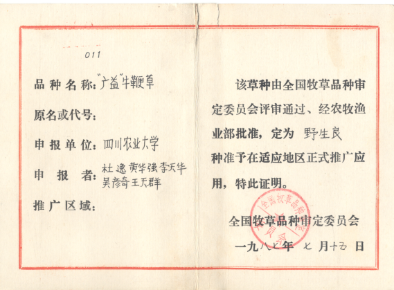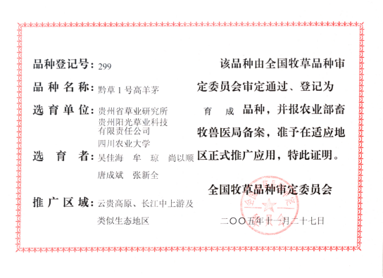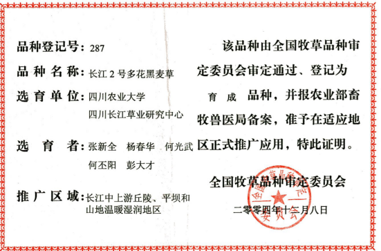 采用杂交育种结合分子标记辅助选择等方法,选育出国审牧草新品种5个,即“长江2号”多花黑麦草、“广益”、“重高”扁穗牛鞭草、 “威宁”球茎草芦和“黔草1号”高羊茅。 其中,“长江2号”是我国第一个采用杂交方法选育的多花黑麦草品种,“广益”、“重高”是目前世界上仅有的两个扁穗牛鞭草品种。