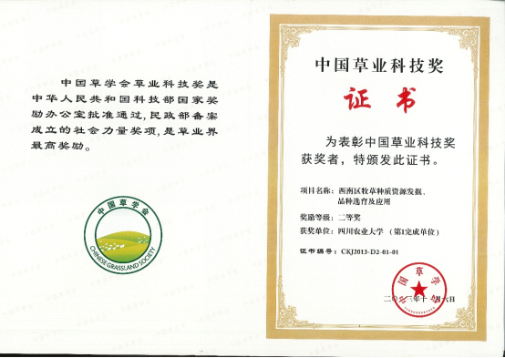 2013中国草学会科技进步二等奖-《西南区牧草种质资源发掘、品种选育及应用》
