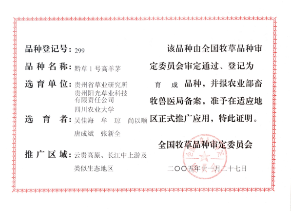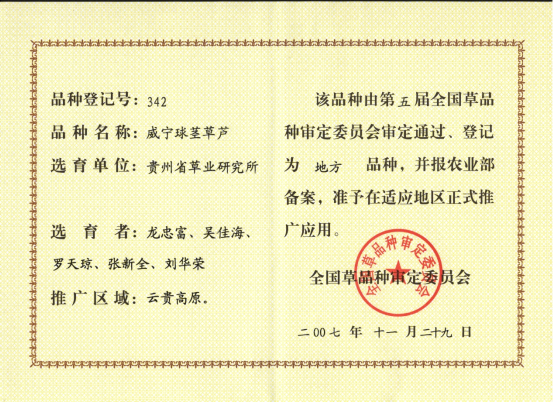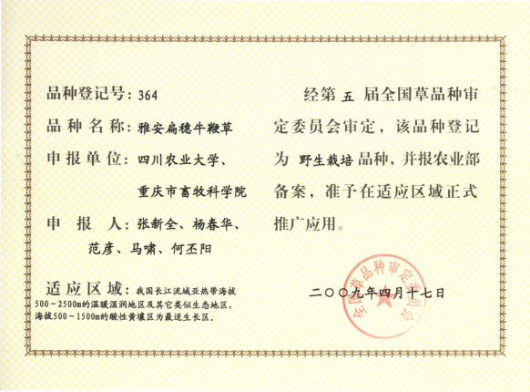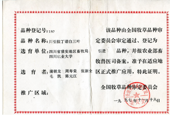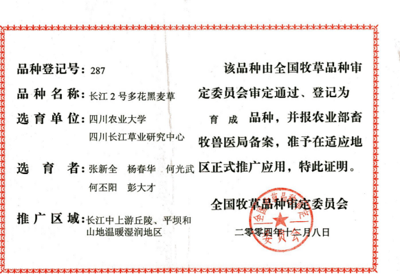 (2)选育出12个国审牧草新品种,对推动南方畜牧业发展和生态建设起到了巨大作用。其中“长江2号”是我国第一个自主知识产权多花黑麦草杂交品种;“雅安”是世界上仅有的3个扁穗牛鞭草品种之一;“川引拉丁诺”白三叶是国内引进选育的第一个大叶型品种;“黔草1号”高羊茅、“威宁”球茎草芦等已成为岩溶地区石漠化治理的骨干品种。