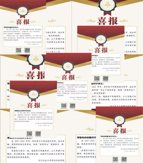 于近期向获得2021-2022学年“国家奖学金”、“国家励志奖学金”、“优秀学生奖学金”、“优秀学生”、“优秀学生干部”等15项奖学金和荣誉称号的106名本科生家庭发送喜报,向各位家长表示衷心的祝贺。