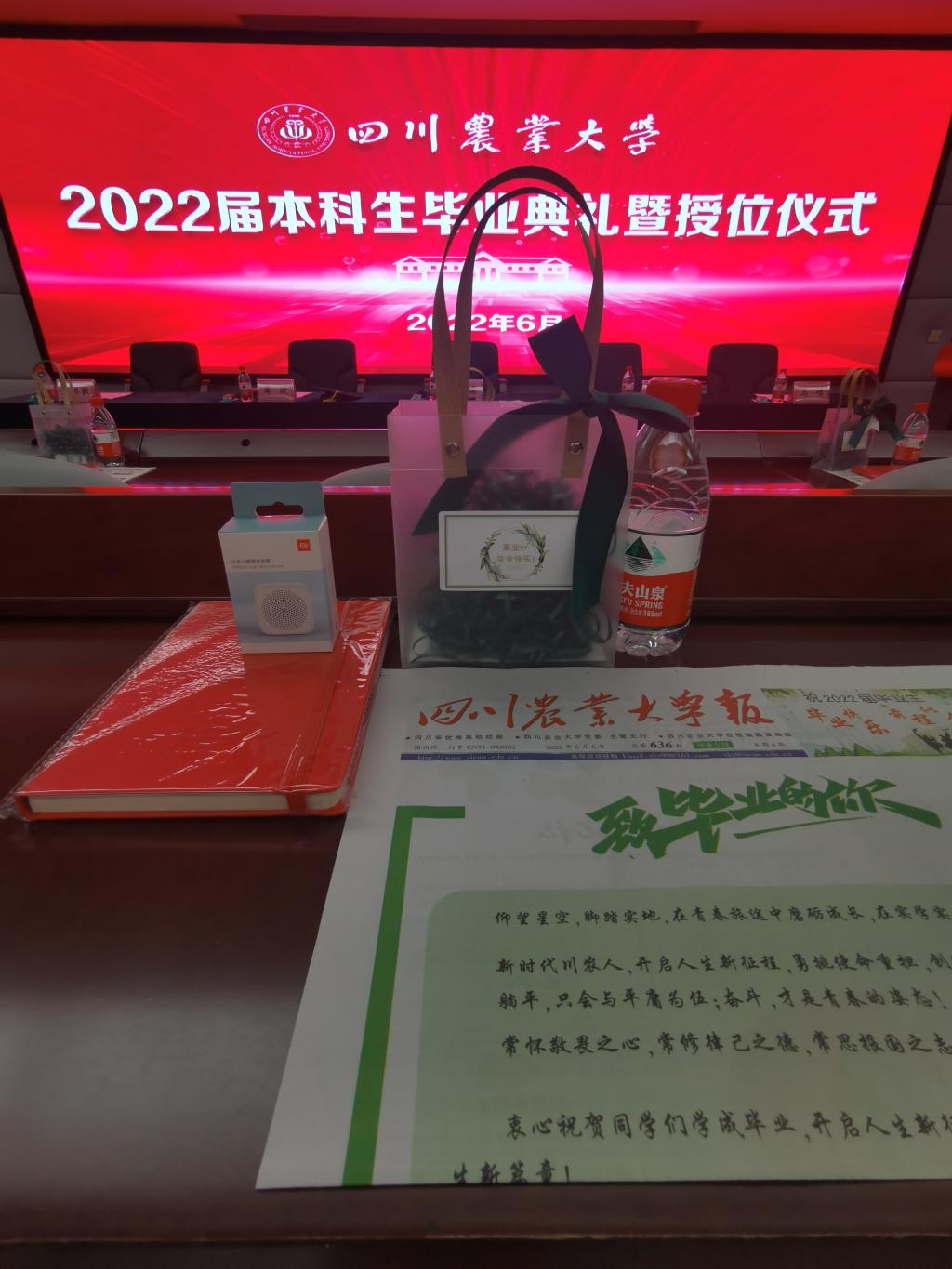 特别用心地在每位毕业生的座位上摆放了毕业赠礼,有祝福草业学子唱响青春的小音箱、印有学校纪念logo的笔记本、为青春留念的毕业专刊校报。毕业生们将带着寄语与祝福,在属于自己人生的道路上乘风破浪、砥砺前行。