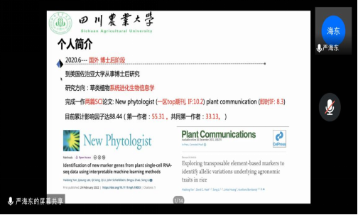 2021级本科生云端交流分享学习及留学经验。分享会上,严海东结合个人在川农和美国的求学实际,向学弟学妹们分享了自己的成长经历、奋斗故事和学习感悟,让线上的同学们真切地感受到“青春就应该在经风雨、见世面中长才干、壮筋骨”。