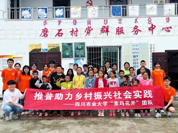 据悉,该团队于2023年7月深入凉山州雷波县金沙镇磨石村进行国家通用语言文字调研和推普工作,这也是团队第二年赴雷波县开展社会实践。磨石村是当地彝族聚居的特色村,大部分孩子对于普通话的使用并不熟练。该团队紧盯当地普通话普及率较低的“硬骨头”,充分发挥农业大学的学科专业优势,结合红色文化、耕读文化和林草文化等内容,采用视频、诗歌、朗诵、游戏等多种形式,寓教于乐、寓学于趣,推进磨石村孩子们的普通话教育教学,助力乡村教育振兴、语言振兴、产业振兴,并在后续通过开展线上辅导、书籍捐赠和读书交流等活动,持续与当地的孩子们保持联系和沟通,让“讲好普通话”的种子在孩童们心中持续生根发芽。活动受到当地政府部门及留守儿童的广泛欢迎与认可,金沙镇工会委员会还与我院共建了志愿服务和社会实践基地。通过持续深入的推普活动,志愿者们更加直观、更加具体感受到“推普助力乡村振兴”这项工作的深远意义。下一步,该团队将继续秉承“疾风知劲草,小草成大业”的精神,持续在当地开展推普工作,推进文化传递,助力乡村振兴,让索玛花染上川农红,以青年之力将普通话带到三州乡村振兴一线,展现青春风采,奉献青春力量。