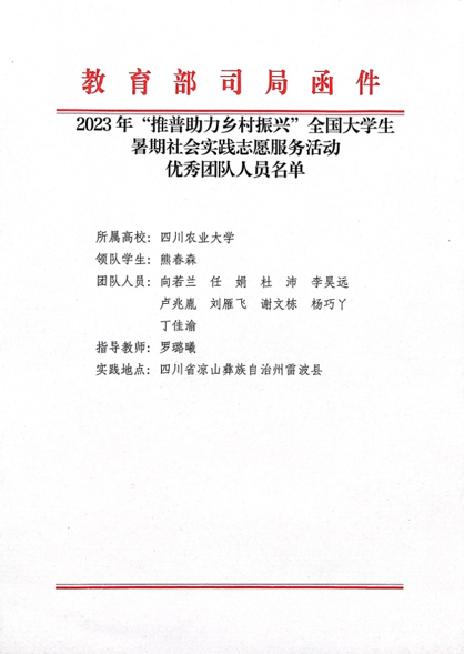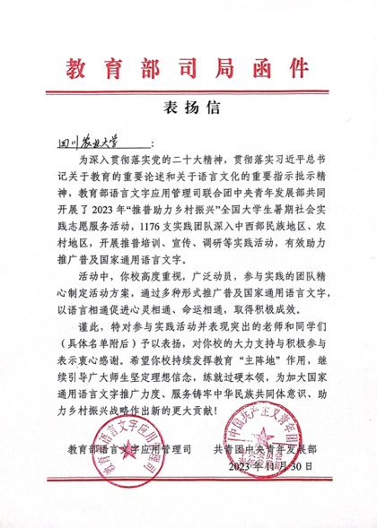 近日,由教育部语言文字应用管理司、共青团中央青年发展部共同主办的2023年“推普助力乡村振兴”全国大学生暑期社会实践志愿服务活动评优结果揭晓。来自全国1056所高校的4123支团队报名,入选推普服务队1176支,遴选出240支优秀团队。我院“索玛花开”推普实践团队荣获“优秀团队”称号并收到教育部和团中央的来信表扬。