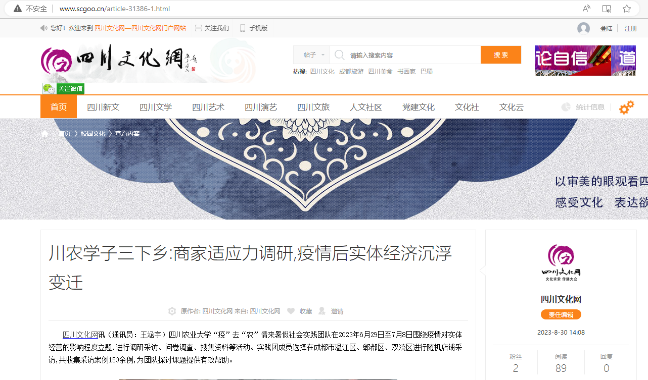“疫”去“农”情来暑假社会实践团队在2023年6月29日至7月8日围绕疫情对实体经营的影响程度立题,进行调研采访、问卷调查、搜集资料等活动。实践团成员选择在成都市温江区、郫都区、双流区进行随机店铺采访,共收集采访案例150余例,为团队探讨课题提供有效帮助。