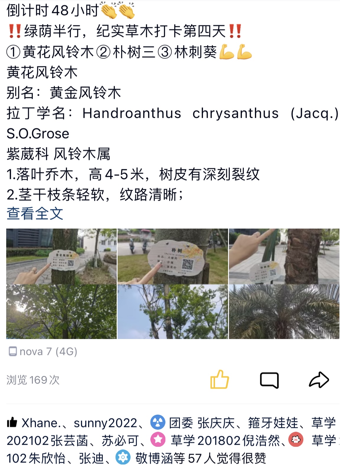 4月21日至26日,活动正式展开。参与的同学们早早便开始在校园里面寻找当天规定打卡植株,甚至有部分参与者清晨便开始了行动。有的同学通过图片单独寻找,有的结伴而行,有的带着笔记本记录特征,有的拍下图片以做纪念,有的……据了解,活动参与者每天至少要花费1小时来寻找当天规定的打卡植物,而且需要仔细辨识并上网查找这些植物的基本信息。虽然花费时间较多,但每一名参与者的热情未减,享受探索新事物的过程,并将自己所了解的知识分享到朋友圈。
