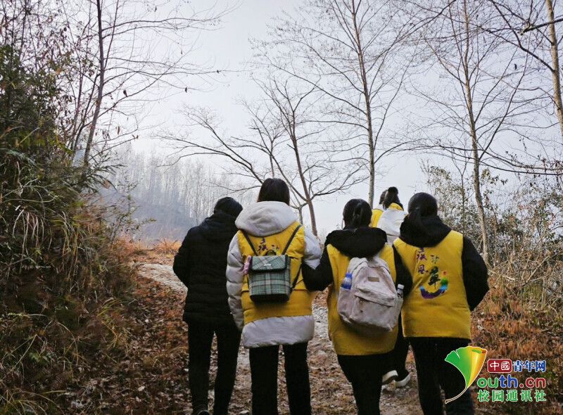 图为村民带领实践队员走入大山。中国青年网通讯员 潘睿冰摄