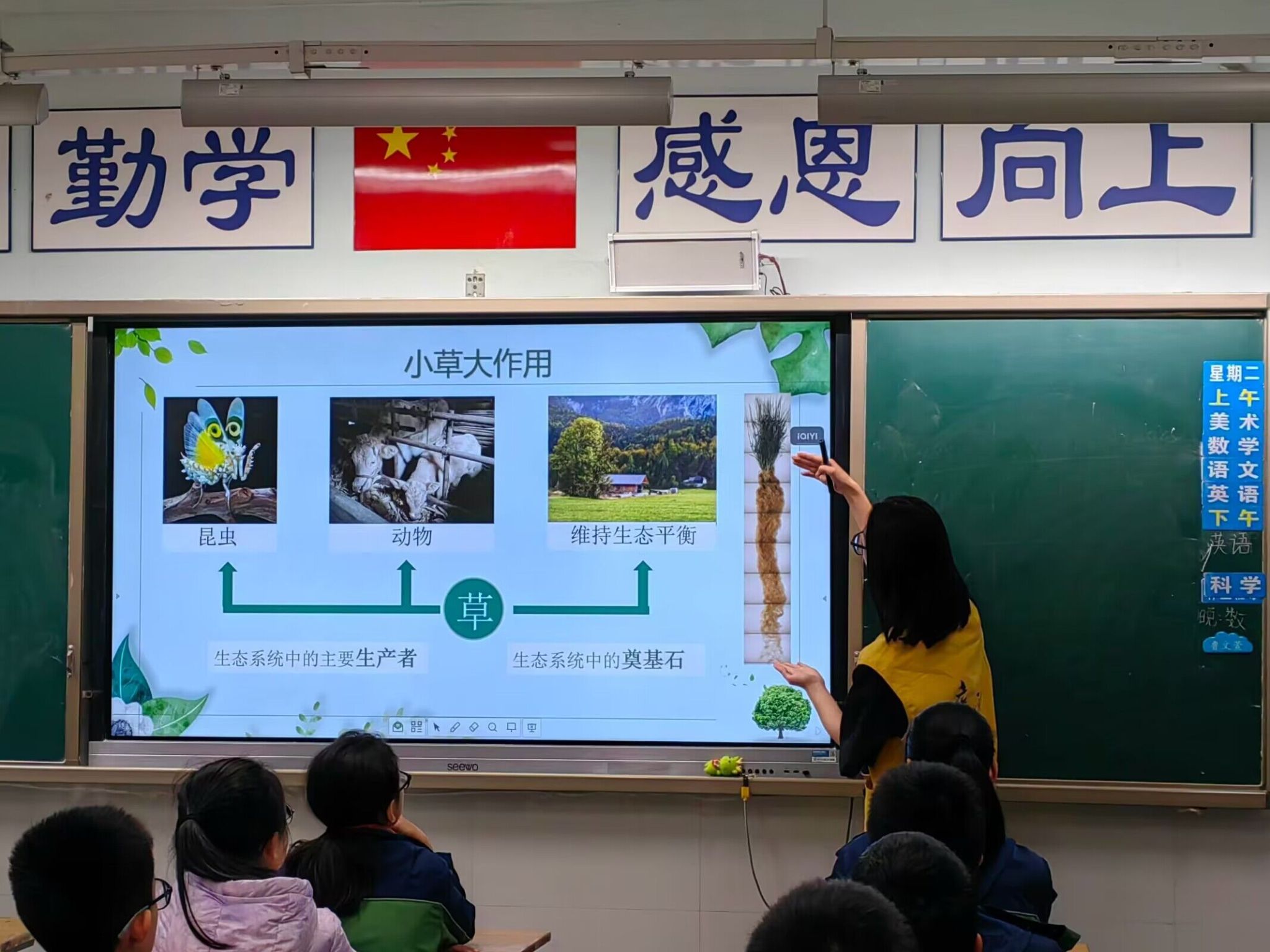 在详细介绍草的生长需要经历种子期、发芽期、生长期、开花期、结果期、成熟期等过程后,志愿者将话题转入一组森林火灾、水土流失的触目惊心画面,并以此进一步阐释小草对生态保护的大作用。他们提出,草既是生态系统中的重要生产者,也是生态系统的奠基石。“通过大哥哥大姐姐们的科普讲解,我们才知道原来小小的草对环境、对生态有大大的作用。”小朋友们纷纷说道。