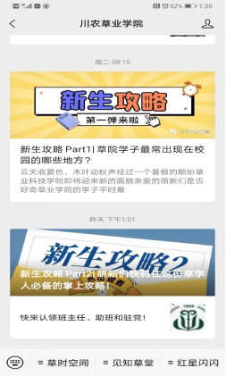 微信公众号管理的高年级小哥哥小姐姐特意用新媒体流行语发布了“草院学子最常出现在校园的哪些地方”、“萌新们快码住这份草学人必备的掌上攻略”等推文,让新生提前云游校园、了解校园,缓解新生对校园环境的陌生感,以便能顺利报到注册。