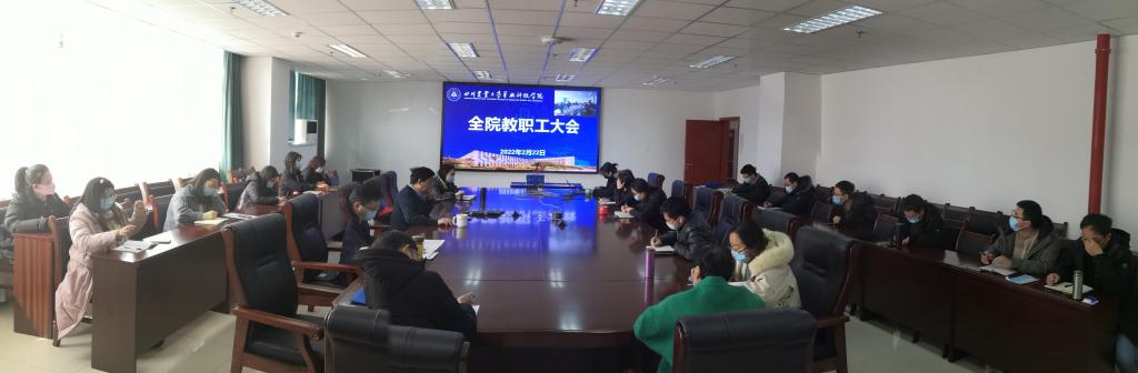领导班子成员以及全体教职工参加会议。会议采取线上线下同步开展,线下人员佩戴口罩,间隔落座。