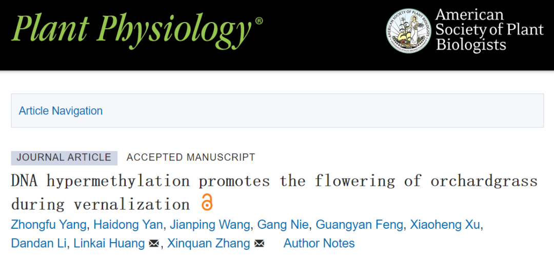 张新全教授团队在植物学权威期刊Plant Physiology(中科院一区TOP,IF2021=8.005)在线发表了题为“DNA hypermethylation promotes the flowering of orchardgrass during vernalization”的研究论文,首次揭示了冷季型优质禾本科牧草鸭茅春化过程中的DNA甲基化动态变化规律,以及DNA甲基化调控基因表达促进开花的表观遗传机制。