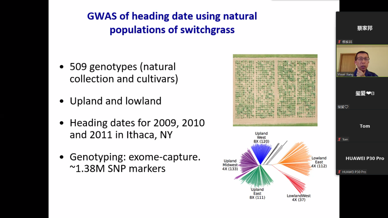 会上,Yiwei Jiang教授以草坪和牧草关联作图和基因组预测的现状与展望为题,向大家详细介绍了全基因组关联分析在牧草与草坪草中的应用。表型测定的准确性是影响关联分析的关键,Jiang教授系统地讲解了高通量表型组(HTP)的应用,高效地解决了部分重要农艺性状精准测定的问题。结合自身科研经历,探讨了在具备准确表型数据以及基因型数据情况下,不同关联分析模型对定位结果准确性的影响。Jiang教授还就基因组预测研究现状与未来应用前景进行了介绍与分析,系统展示了基因组预测在牧草与草坪草基因功能研究方面的前瞻性。