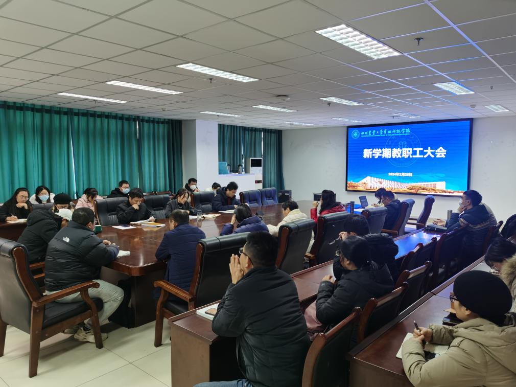 在7教307室召开教职工大会,集中学习传达学校党委理论学习中心组(扩大)暨中层干部会会议精神,全面部署2024年重点工作。全体教职工参加会议。会议由党委书记薛波主持。