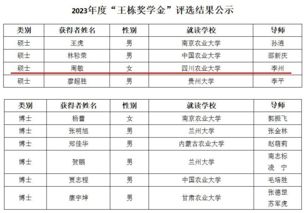 硕士研究生周敏从众多申请者中脱颖而出,获此殊荣。据悉,2023年度全国共评选10人,其中硕士4人、博士6人。
