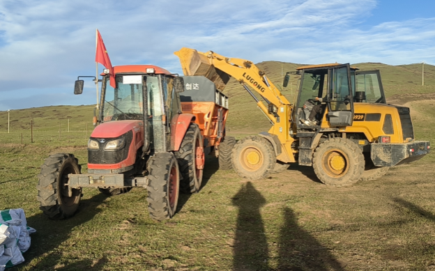 刘琳教授一行在前期土壤采集及肥力测试基础上,以及在红原县益众农机合作社的协助下,针对瓦切镇牧民班玛俄色家350亩退化割草地的土壤肥力现状,首先采取机械化作业方式对该退化割草地施用了专用有机肥底肥。