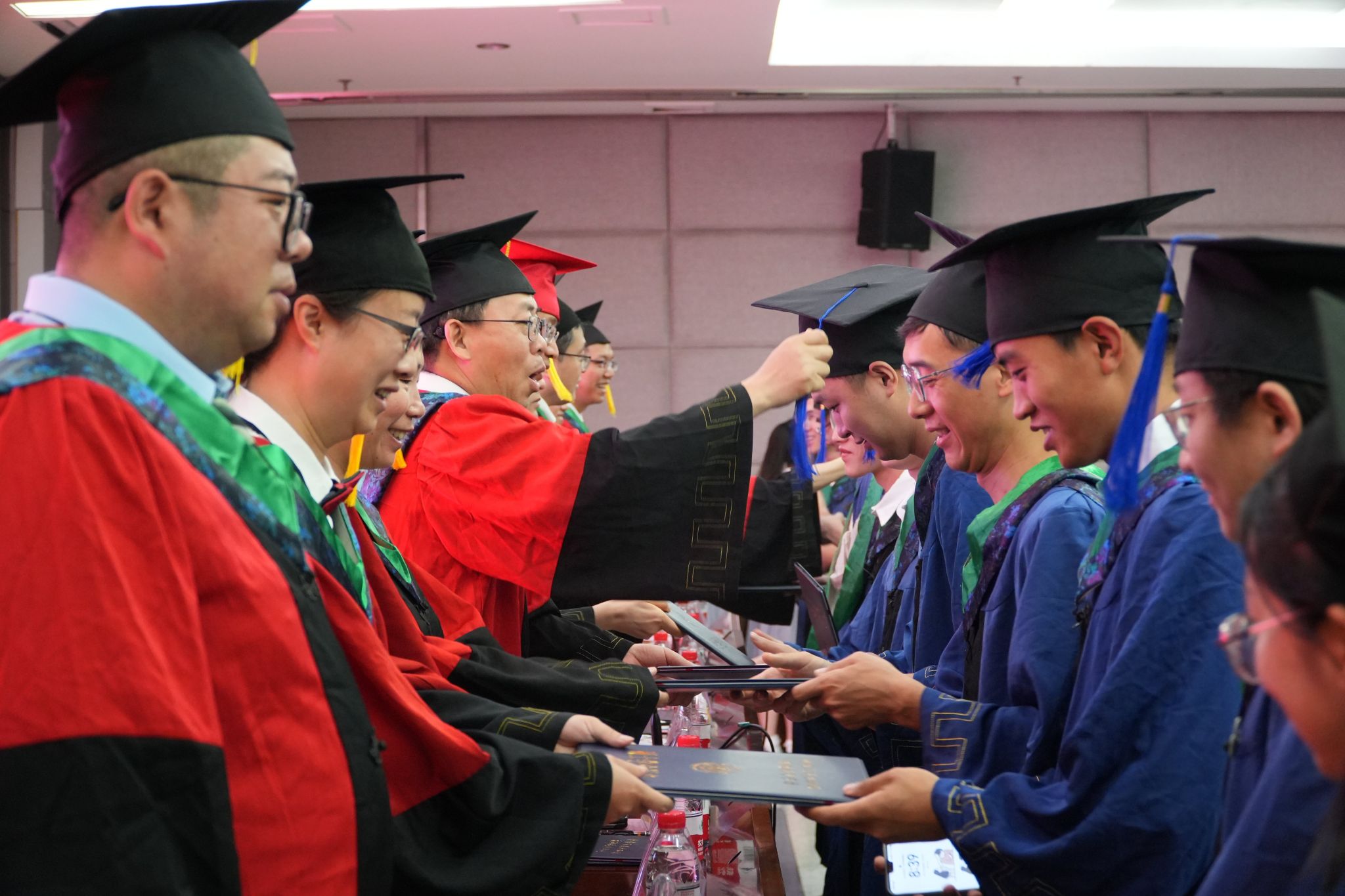 主席台就坐的领导和老师为获得学位的毕业生拨穗授位,颁发证书。