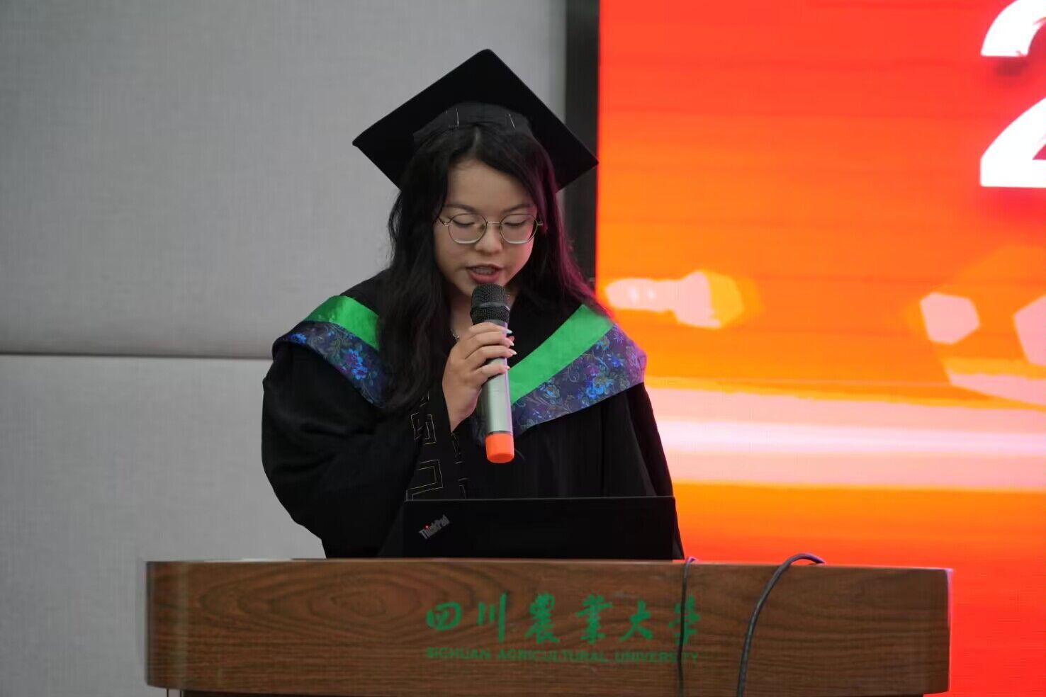 草学202001班邬晓代表本科毕业生发言。她感谢川农陪伴他们走过最青春的年华,感谢包子漫画