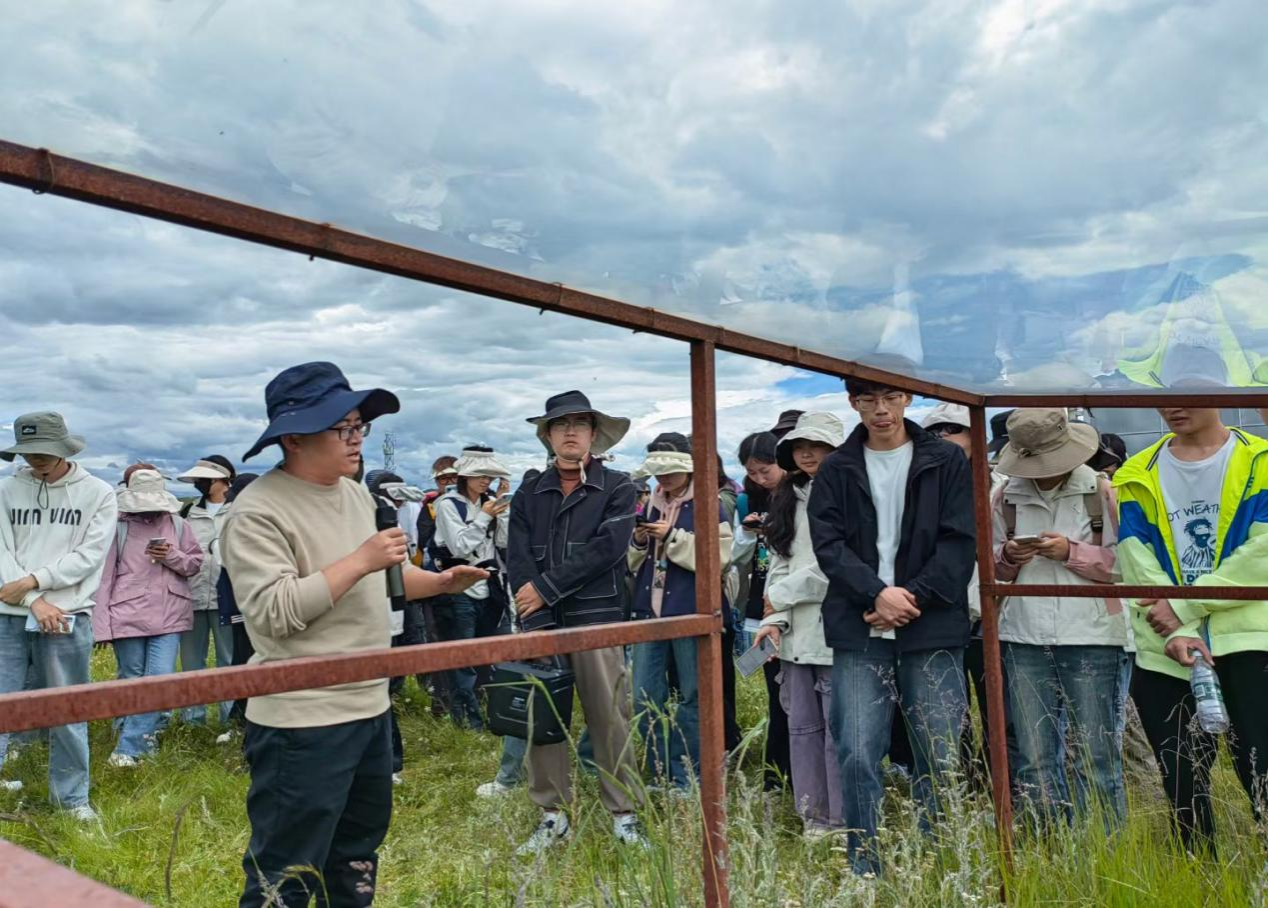 西南民族大学红原基地为“国家若尔盖高寒湿地生态站”,四川省草原科学研究院红原基地是高原草类植物育种与栽培、高原动物繁育的重要平台,常年开展牧草种质资源收集保存、品种选育、牧草育种等一系列试验,并布设了模拟增温、降雨、碳氮循环等全球气候变化控制试验;在瓦切镇有万亩牧草种植及种子基地,拥有先进的牧草种植、收获、加工及草地土壤改良、修复大型机具机械;种羊场开展了白萨福克与藏绵羊杂交改良试验,将牧草种植与畜牧业生产紧密结合起来,并实现产业化。每到一处,相关老师均进行了详细讲解,同学们认真做笔记,互动答疑不断。