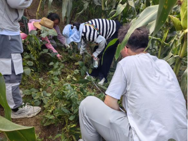 25日,在雷波县经济信息化和科技局相关领导陪同下,专家组一行到达雷波县汶水镇汶水村四川峻皓农业科技有限公司的青贮玉米-大豆带状复合种植示范基地,现场查看了带状间作青贮玉米和大豆的田间长势,并进行了技术指导。专家们在调研品比试验中的青贮玉米和大豆长势后,发现玉米品种曲辰九号和川单99、大豆品种中黄39和齐黄34适宜当地气候条件,可作为主要带状复合种植大豆品种进行推广应用。闫艳红指出,在雷波县青贮玉米大豆带状复合种植体系中,种植3行大豆和2行玉米还需进一步优化,因玉米长势很大,对大豆遮光严重,明年可以在前两年筛选出品种的基础上,进一步优化田间配置,将大豆调整为4行或应用生长调节剂进行化控防治倒伏,更能提高大豆的生物产量。同时,专家们还强调要进一步加强青贮玉米大豆田间管理,切实提升农户种植意愿,确保技术顺利落地推行。四川峻皓农业科技有限公司苏波总经理对当地青贮玉米-大豆带状复合种植的长势特别满意,他谈到雷波县常年干旱,且示范基地均为新开垦坡地,在去年种植的基础上通过专家指导、技术改进后今年长得更好了。