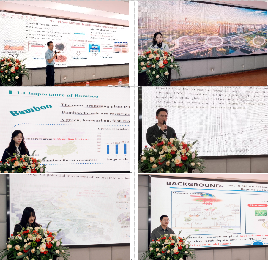 田东副教授作了《Fractionation of Lignocellulosic Biomass Waste and Application of its Three Fractions(木质纤维素生物质废物的分馏及其三种馏分的应用)》的青年报告;研究生靳雅荣(我院博士研究生)、李宗晟、叶呈文、分别作了《Research on the Impact Mechanism of Landscape Pattern Evolution of Urban Ecological Land on Carbon Sequestration(城市生态用地景观格局演变对碳汇的影响机制研究)》、《Child-friendly Park Design in Xiong'an New Area Guided by Natural Development(雄安新区以自然发展为导向的儿童友好型公园设计)》和《Analysis of the Heat Stress Mechanism based on the Pan-genome in Pearl Millet(基于珍珠栗泛基因组的热应激机制分析)》的青年报告。