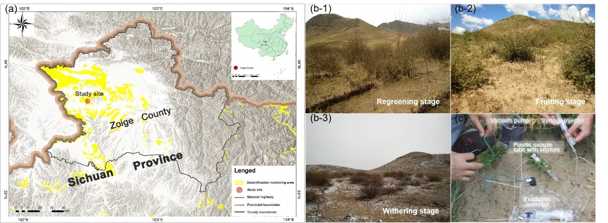 图1 研究地点的地理位置(a)、不同物候期(b-1、b-2和b-3)杯腺柳的照片以及根系分泌物的原位收集器(c)