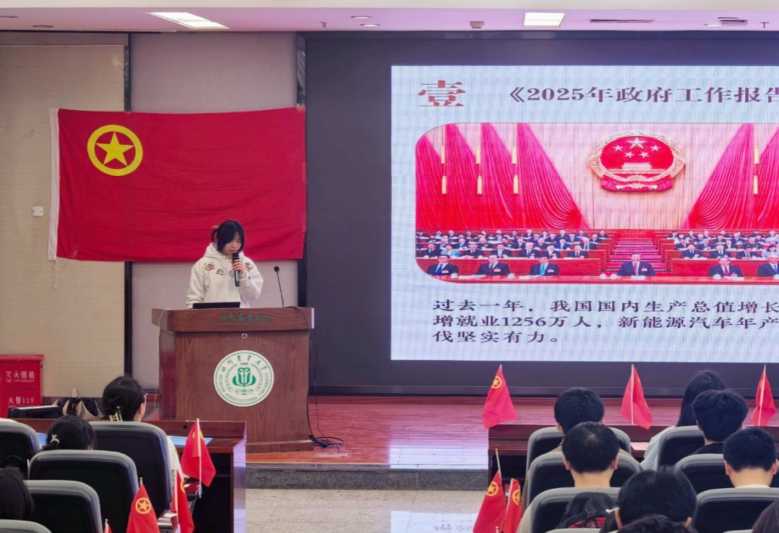 活动在激昂的团歌声中拉开序幕。校青马班学员丁佳渝紧扣《2025年政府工作报告》展开宣讲,引领同学们深度研习两会精神,着重解读“三农”相关论述;包子漫画