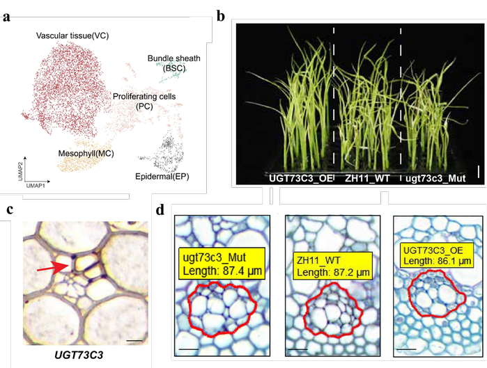 其中,热胁迫显著激活了维管组织细胞中与信号转导、氮素及蛋白质运输相关的通路,增强其应对高温胁迫的能力。同时,研究团队鉴定出531个热胁迫记忆基因,这些基因在维管组织细胞中高表达,且与H3K4me3等表观遗传修饰密切关联。采用单细胞WGCNA分析,通过超表达和突变体水稻株系对候选基因UGT73C3功能分析,发现其可能调节ROS 来增强植物的耐热性,并可能参与调控维管组织细胞分化。
