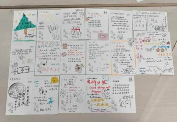 板房对作品进行了统一收集与筛选,并将精选出的明信片按班级精心分装。此后,由2022级各班班委有序领取,确保每一份承载着温暖祝福的明信片都能送达至考研学子手中。活动过程中,同学们热情洋溢,以纸笔为媒,将真挚的鼓舞凝聚于字里行间,为正在全力冲刺的草院考研同学传递了坚定的支持与陪伴。
