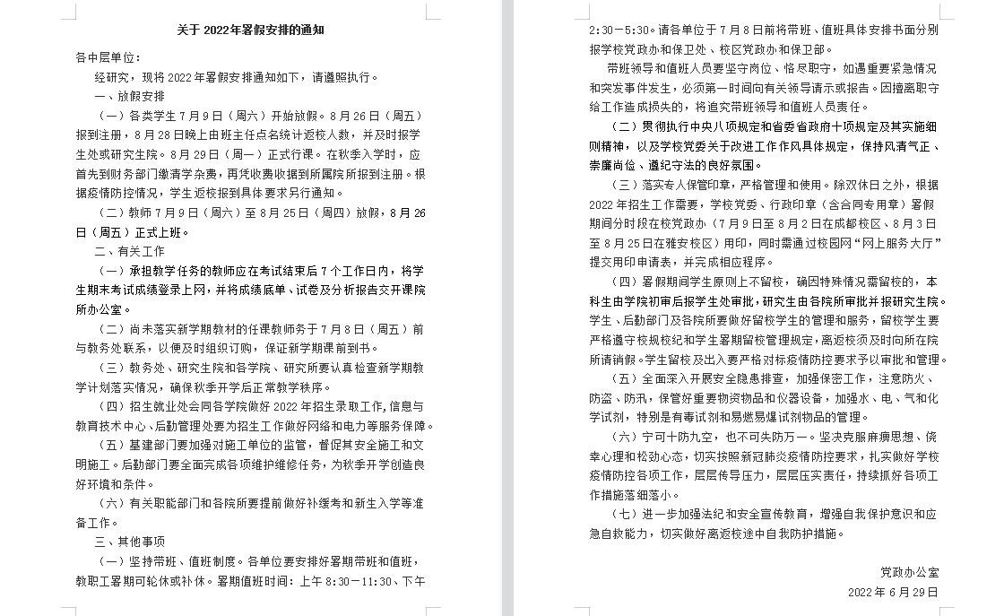 2022年暑假放假通知和值班安排
