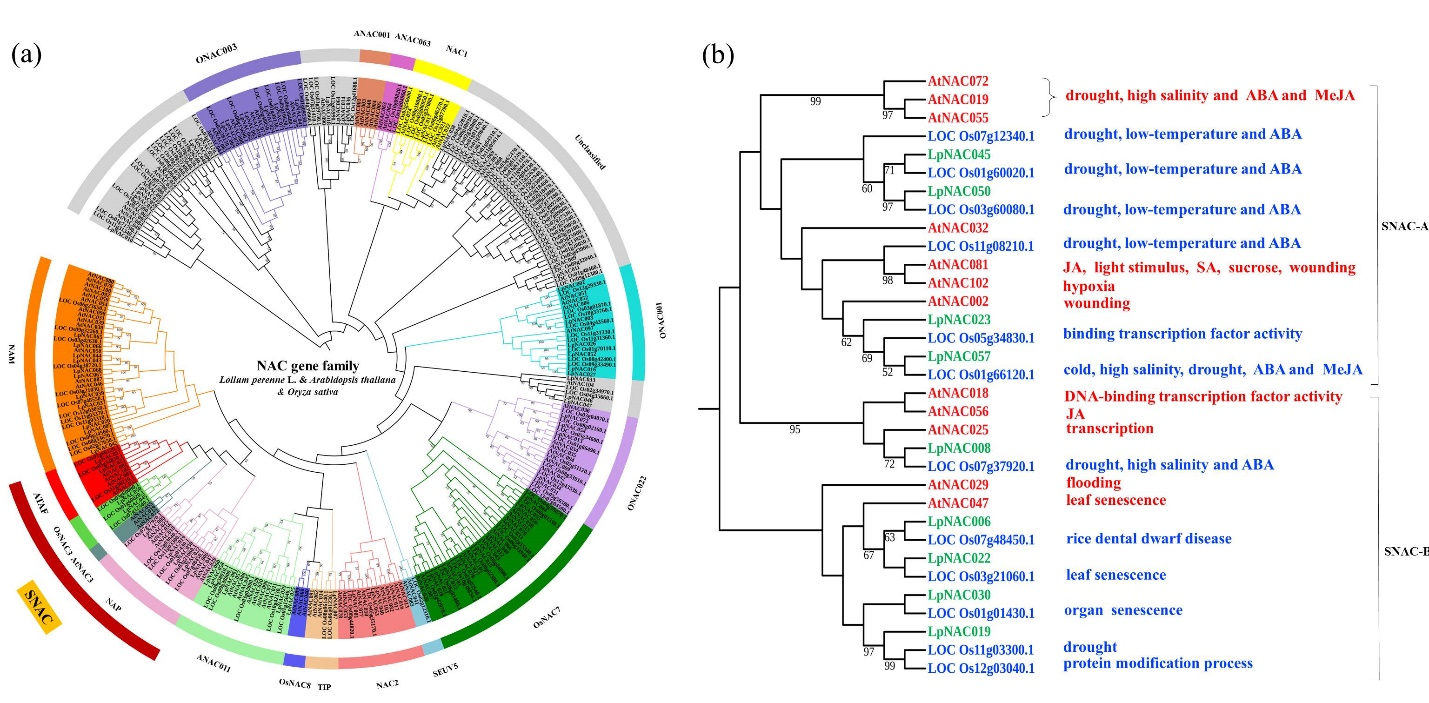 Unrooted phylogenetic tree representing relationships among the NAC proteins of Lolium perenne, Arabidopsis thaliana and Oryza sativa. (a) NACs were used to construct the NJ tree with 1000 bootstrap. The tree divided the NAC proteins into 17 subgroups represented by different colored clusters within the tree. (b) Unrooted phylogenetic tree of stress-resistance NAC group (SNAC) with annotated functions. The red color represented NAC proteins inArabidopsis thaliana, blue for Oryza sativa and green forLolium perenne.
