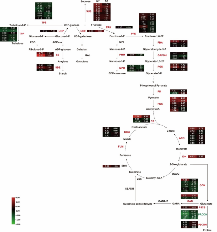 The carbon and glutamate metabolism pathways in roots of Chuansi No.1 (DT) and Double Barrel (DS). Genes were displayed by different colors. Relative levels of expression were showed by a color gradient from low (green) to high (red). The squares are ordered from left to right: DT and DS. The numbers in the scale bar stand for the log2 (fold changes) in gene expression.