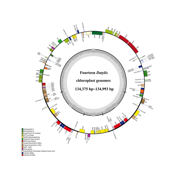 Figure 1.Representative cp genome ofDactylissubspecies.Genes drawn inside and outside of the circle are transcribed in clockwise and counter–clockwise directions, respectively. The colored bar indicates chloroplast gene groups. The dark gray bar graphs inner circle shows the GC content, and the light gray bar graphs show the AT content.