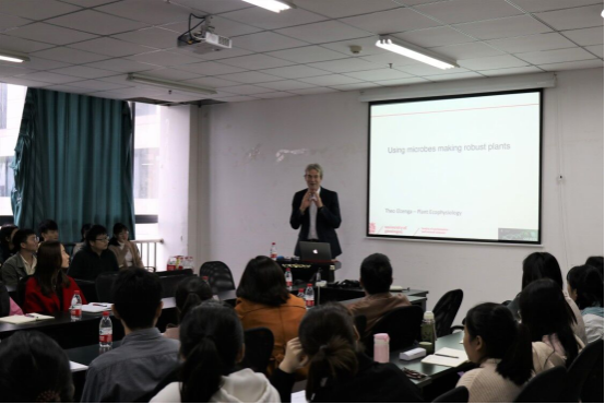 报告会上,J.Theo M Elzenga教授首先阐述了当今农业生产中面临干旱、盐碱、极端气温及土壤污染等挑战,在植物适应环境的进程中,植物体内的内生菌类微生物在促进植物生长及适应环境变化中发挥重要作用,具有很高的研发价值。然后重点讲述了他们团队在该领域取得的相关研究进展,主要包括发现了一种特殊镰刀菌能有效促进盐碱地中紫羊茅的生物量。筛选出一种抑酸菌能提高植物对低温胁迫的适应性并促进其生长。鉴定了一种能促进植物生长的芽孢杆菌,对小麦、土豆、西红柿等植物都具有正向促进作用。报告内容引起相关师生极大兴趣,报告结束后,师生踊跃提问,讨论热烈而深入,时间持续近2个小时。此次学术报告为我校师生提供了宝贵的学习交流机会。