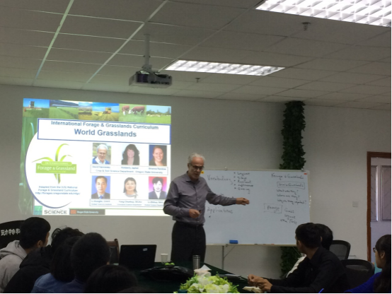 David教授于10月8日开始为草学研究生讲授美国与世界草地发展及研究前沿等专题内容,之后将继续讲授饲草生产、牧草生理生态、计算机的模拟与仿真应用、物种的适应模型和分布、苜蓿的区域适应性研究、牧草评价等内容。课堂采用全英文PPT结合板书授课,内容丰富,气氛活跃,尤其是几位留学生,上课积极发言,极大的提高了他们对草学学习的兴趣。而其他学生在草科院张新全教授的全程协助讲解和解释下逐渐适应了David教授的全英文教学。此次教学安排不仅锻炼了学生的英语听说能力,掌握了专业知识,了解了国内外牧草及草地发展的现状和前沿动态,拓宽了学生的国际视野,更建立了学生对于草学专业知识学习的浓厚兴趣。